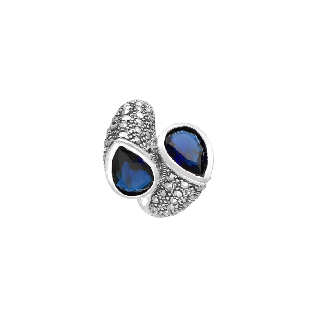 Efektowny pierścionek łezki z szafirowymi cyrkoniami i markazytami srebro