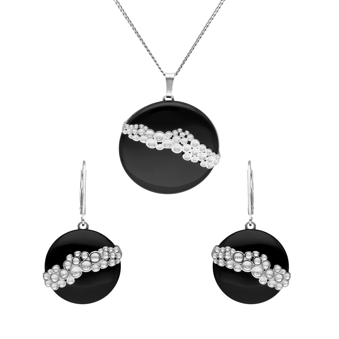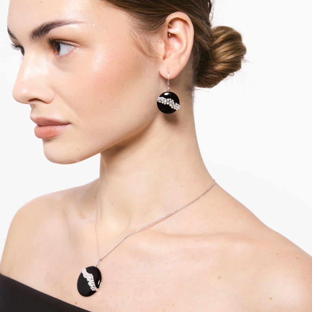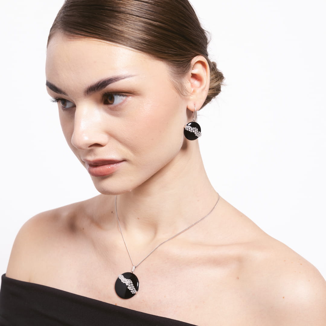 Srebrny zestaw z onyksem, składający się z kolczyków i wisiora, to elegancka biżuteria, która łączy w sobie klasykę i nowoczesność.